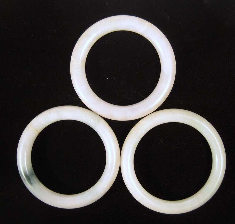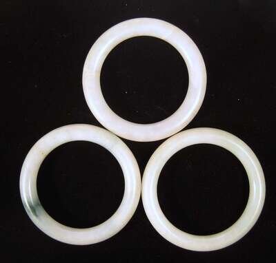 Mottled celadon jade bangles with occassional splashes of deeper green hue.