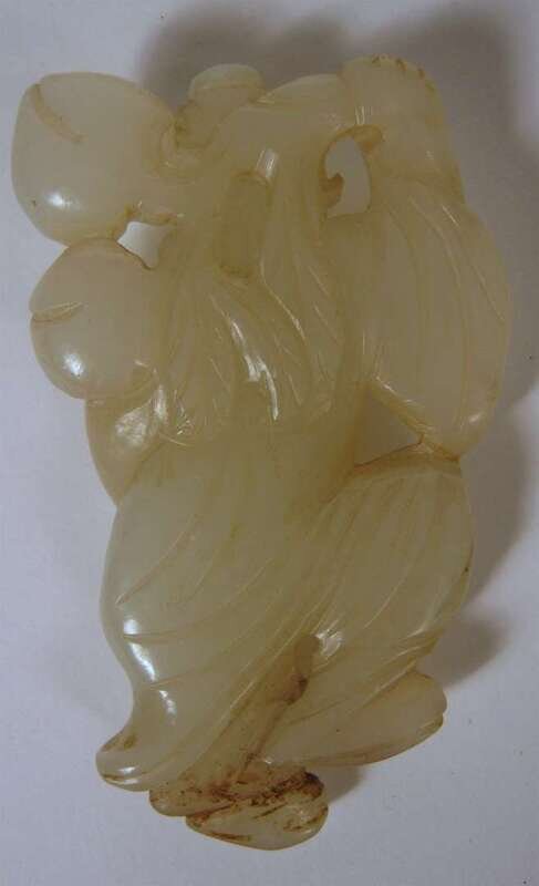 Carved to depict a standing figure holding peach brunch.