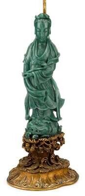 Standing figure grasping ruyi carved to show strong drapery, over mythical beats and celestial clouds, on later associated gilt wood base.