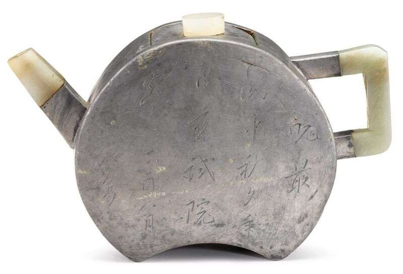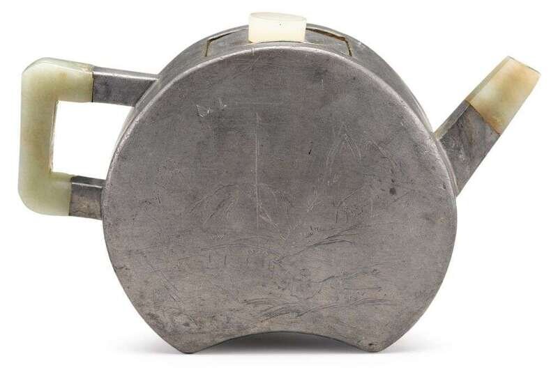 Chinese pewter and jade mounted teapot dated either 1897 or 1957, signed shi quan