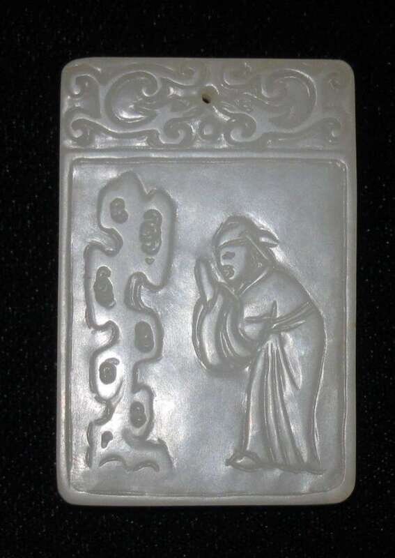 Typicaql rectangular form, carved to show scholar and attendant, script verso.
