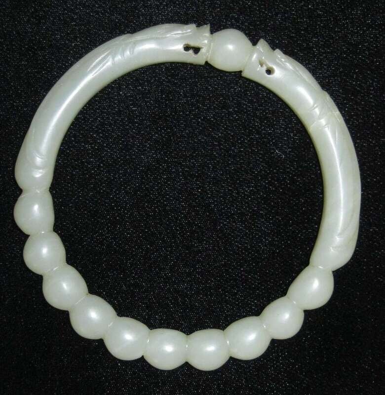The circular bracelet carved to one half as two qilong joined by a single bead and to the other half to resemble ten adjoining beads.