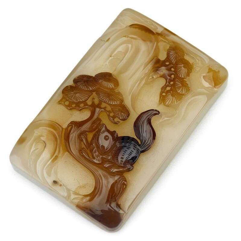 The rectangular pendant carved in relief to show a brown squirrel on a pine branch over a light translucent ground.