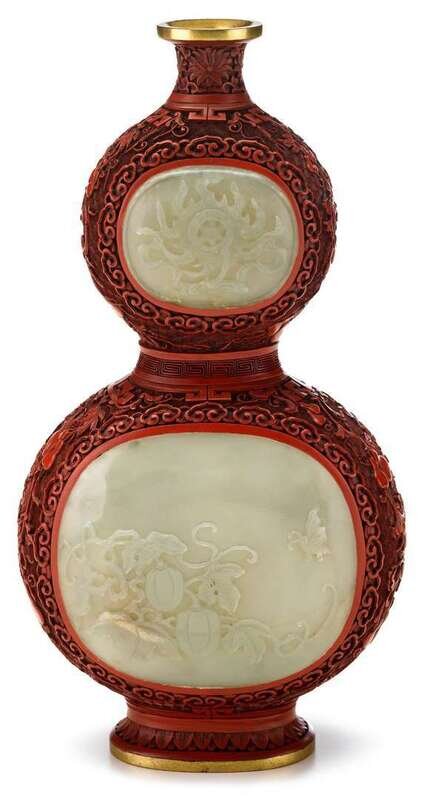 Fine Chinese white jade mounted and carved cinnabar lacquer gourd vase qianlong mark