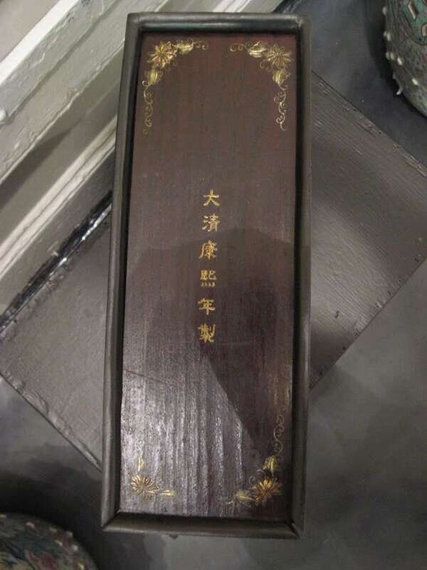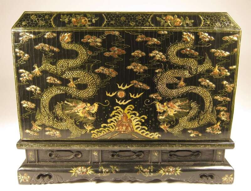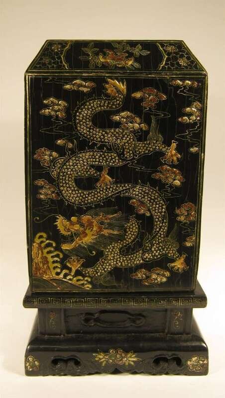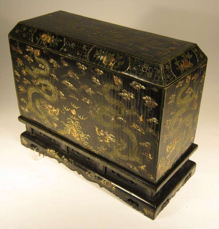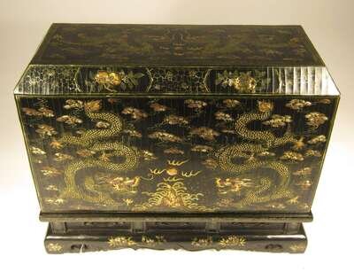 Cover decorated in gilt with dragons chasing pearls above rock and wave patterns; interior removable top panel inscribed with Kangxi mark; raised on a rectangular and waisted key fret border.