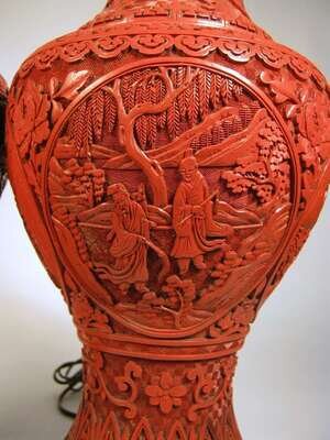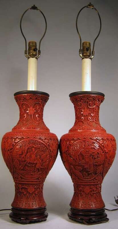 Converted to lamps, baluster form, carved to show figural cartouches framed by Indian lotus blossoms, over wood stands.