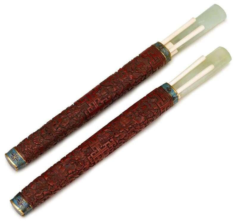 Pair of Chinese enamel and carved cinnabar utensil case 18th century