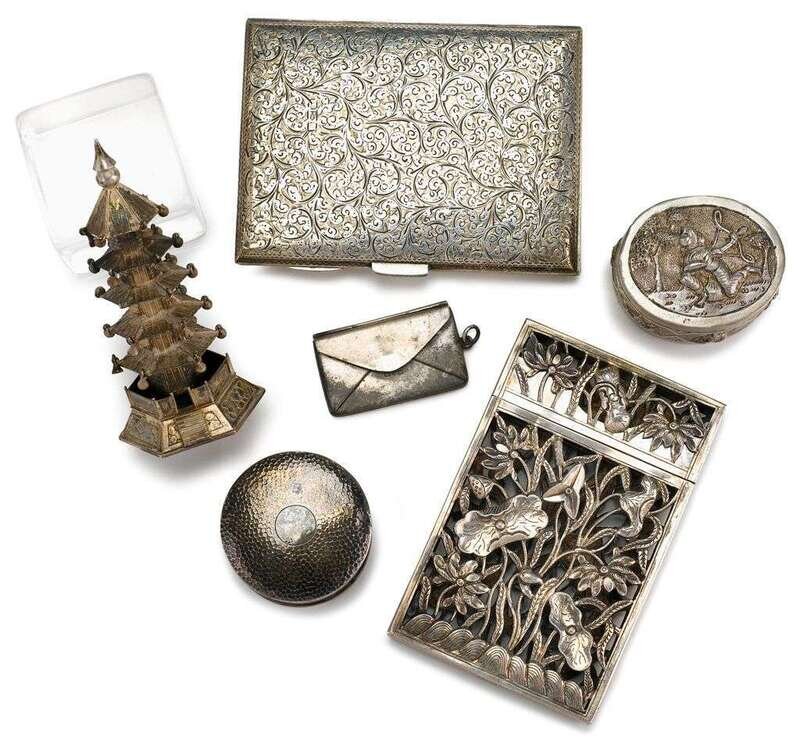 Comprising a rectangular, incised foliage silver wallet with leather and ivory dividers inside, an openwork lotus pattern cardcase, two paste boxes and a miniature pagoda with freely suspending bells, and a miniature clutch purse.