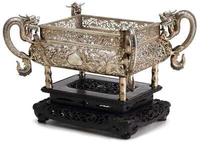 The rectangular pierced silver jardinere decorated to exterior with chrysantamums, bamboos, plums and dragons and flanged by a dragon at each corner, raised on tall feet simulating bamboo branches; Incised with "presented to Mr. and Mrs. G. A.Combe by a few friends on their departure from Wuhu, March 1911"; with fitted glass liner and hardwood stand.