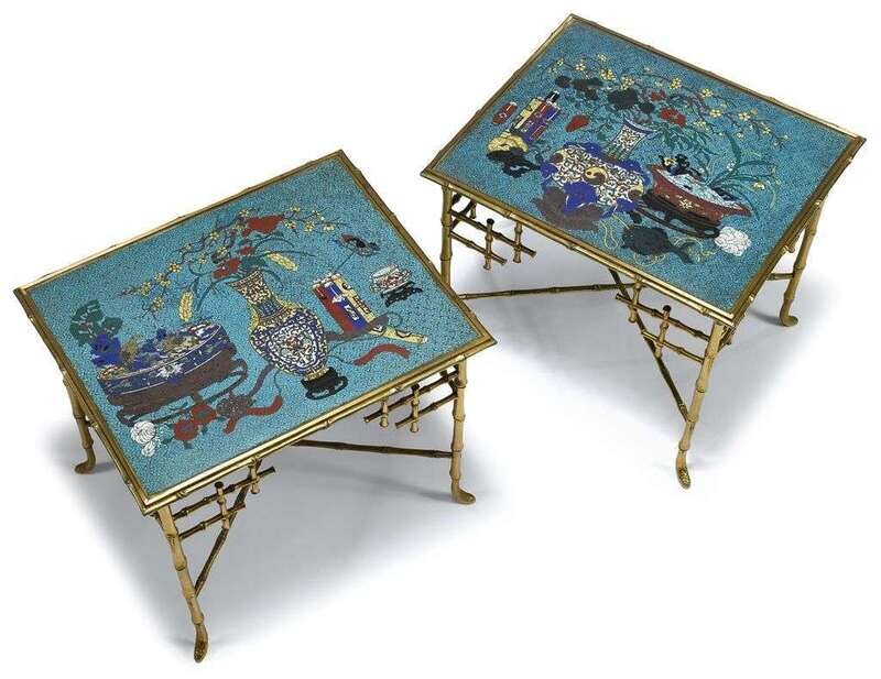 The rectangular panel vividly decorated to show a still life assemblage of precious objects including a vase, a jardiniere containing two birds, a ruyi, a censer, and a bundle of scrolls; set in a fine twentieth century french gilt metal table designed at Parisian interior decoration studio Maison Jansen.