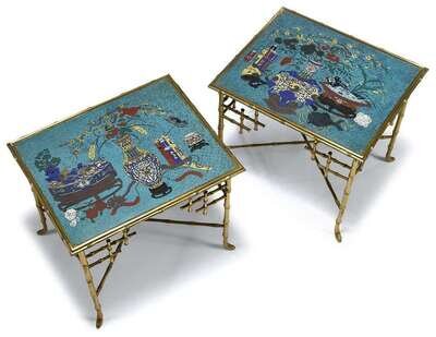 The rectangular panel vividly decorated to show a still life assemblage of precious objects including a vase on stand, a jardiniere, a fish and a bundle of scrolls; set in a fine twentieth century french gilt metal table designed at Parisian interior decoration studio Maison Jansen.