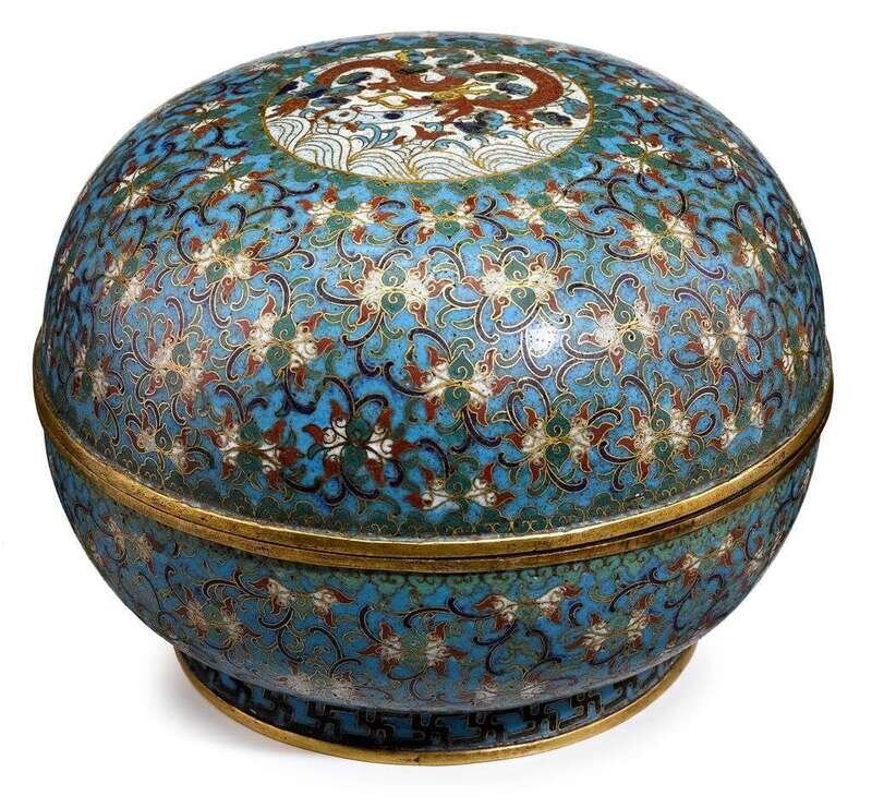 Domed cover with gilded edge, the top centered with circular medallion showing coiled dragon over celestial sea, over blue ground with Indian lotus blossom, conforming base, raised on gilt metal foot rim.