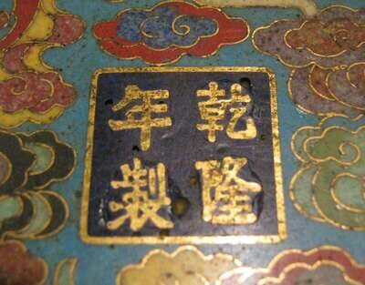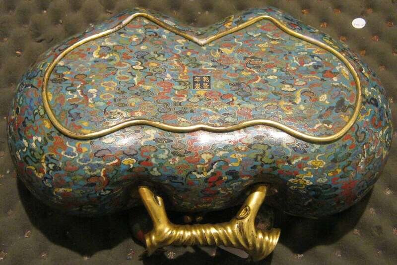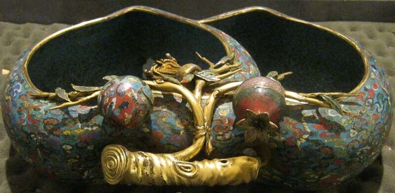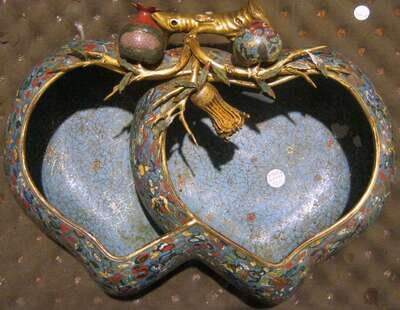 The large double peach form bowl enameled to exterior with clouds and to interior with ice and plum blossoms, handle cast to resemble a branch bearing peach and gild around mouth rim, pomegranate and citron fruits.