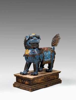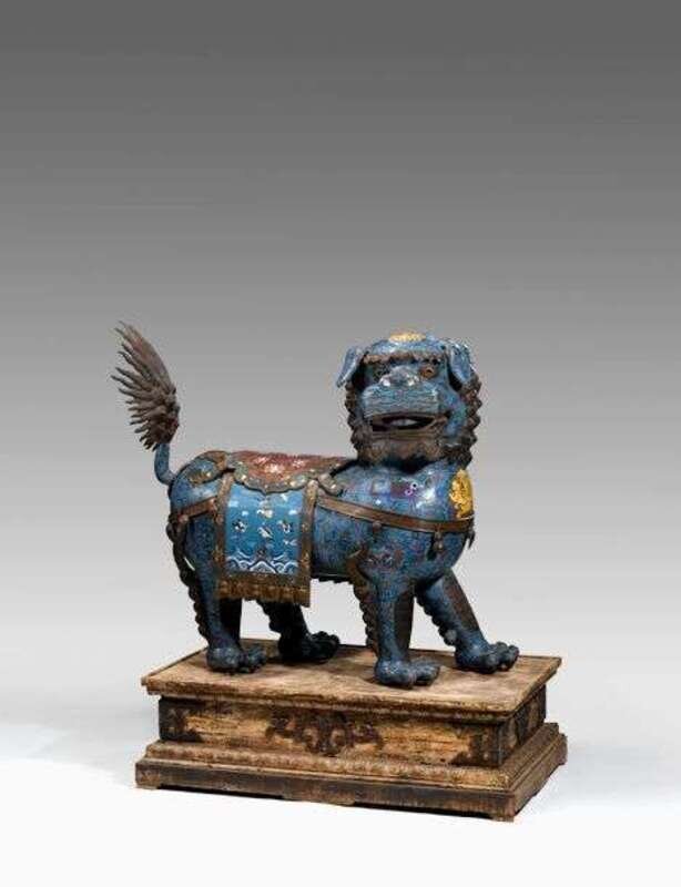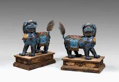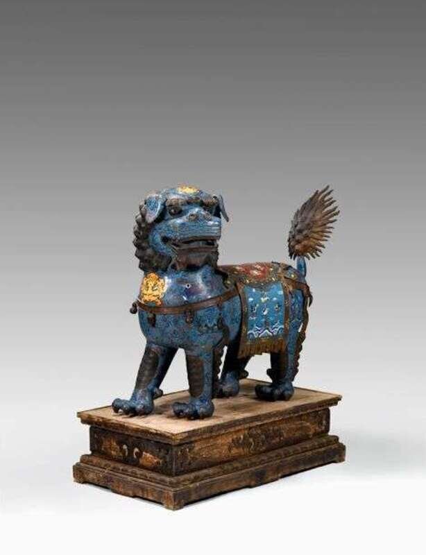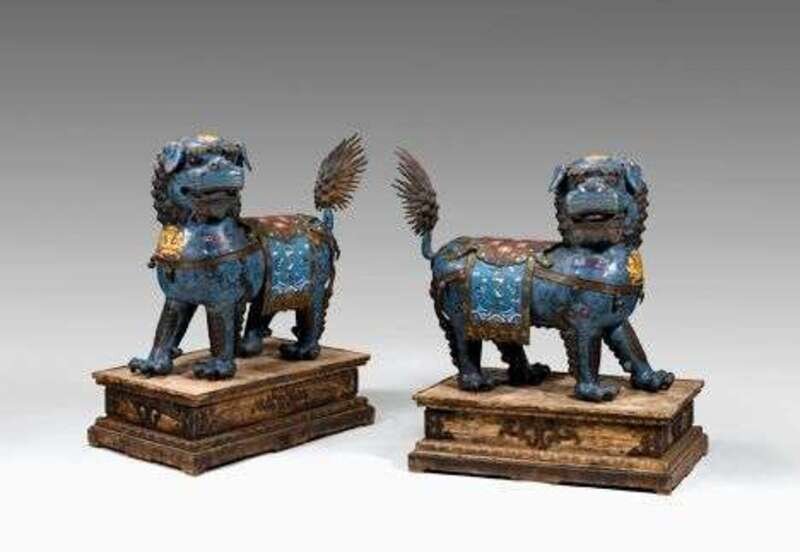 Pair of rare and monumental Chinese cloisonne enamel models of standing Fu Lions on stand late qing dynasty