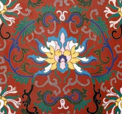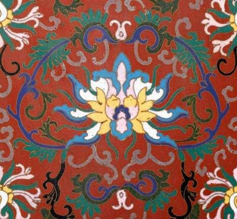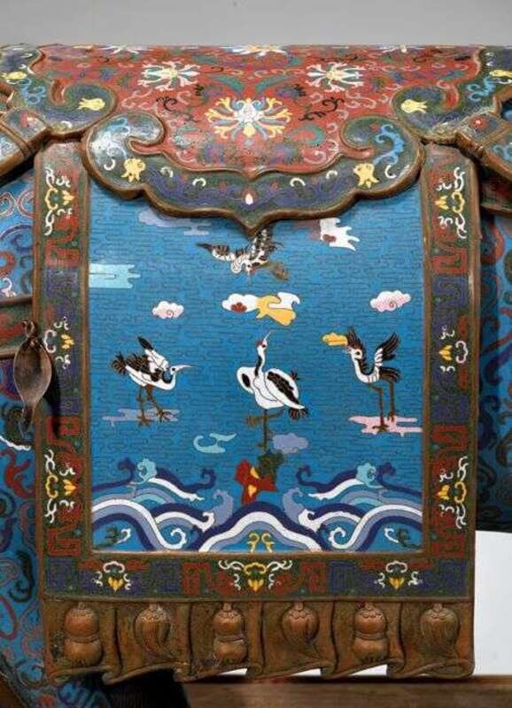 The finely cast copper models are of three parts, comprised of a coiled fan shaped and enameled tail, body with copper head enameled to the chest and shoulders to show a yellow archaic mask on typical light blue ground with a profusion of purple, red and green lotus leaf scrolls, the saddle and harness is modeled with free hanging fruit from pendants and enameled with an impressive ruby red seat detailed to show yellow Indian lotus flowers and scrolls, the saddle flaps show detailed egrets over a scrolling sea, over period wood base.