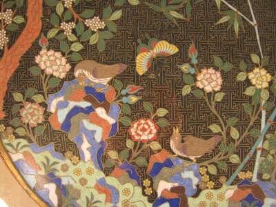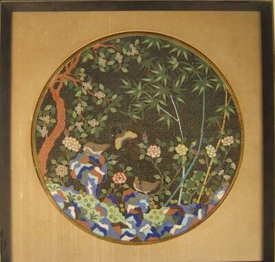Circular form, enameled to show rock work and butterfly to black ground, framed and glazed.