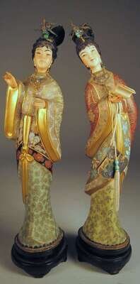 Standing models with ivory like heads and hands, raised on wood stands.