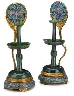 Pair of Chinese gilt metal closionne and green jade prickets qianlong mark