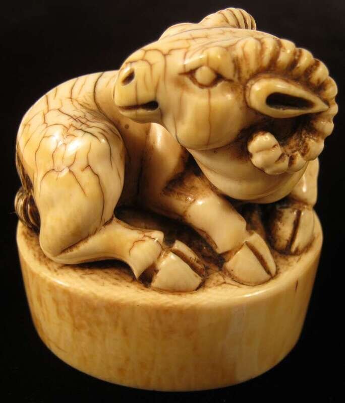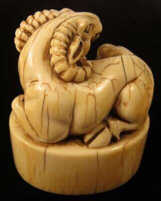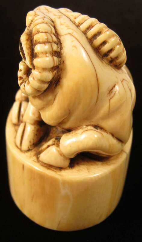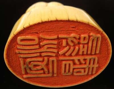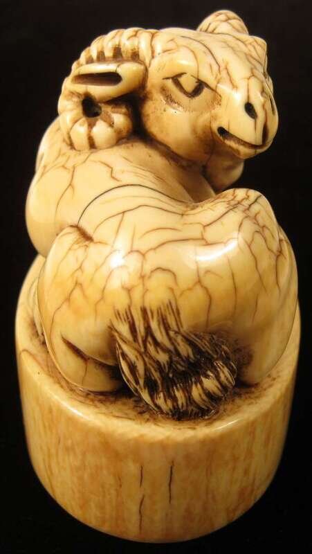 The four character ivory seal surmounted by a recumbant lamb.
