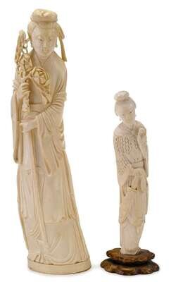 Comprising a tall standing meiren in loose robes holding a flowering branch and a long-handled gardening tool and a warrior woman figure dressed in ancient armor and bearing a sheathed sword.