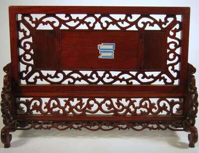 The rectangular lattice carved screen mounted with three panels depicting mountain landscape, over conforming stand.