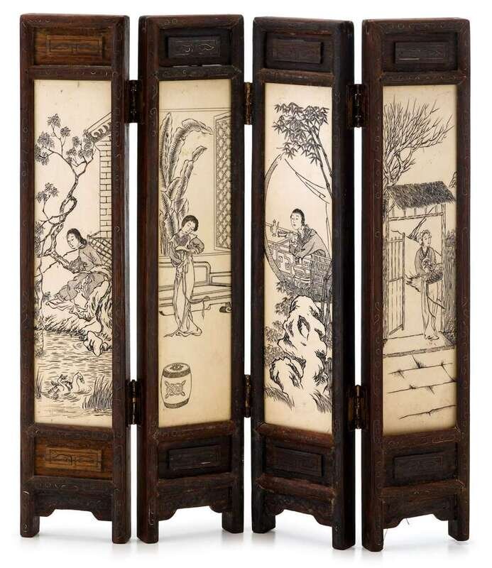 Comprising four tall ivory and ink-work panled framed by wire inlaid frame.
