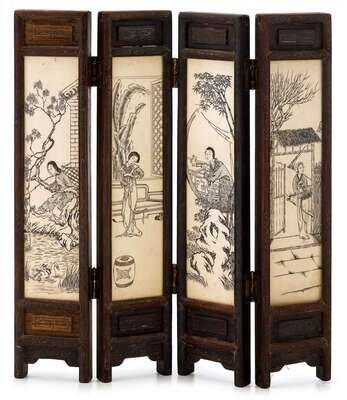 Chinese carved and ink-work elephant ivory and hardwood miniture table screen 19th century