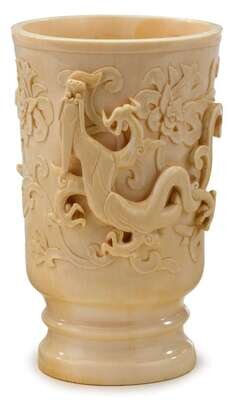 Tall cylindrical body carved to show qilong dragon and Indian lotus blossoms, over confoming foot.