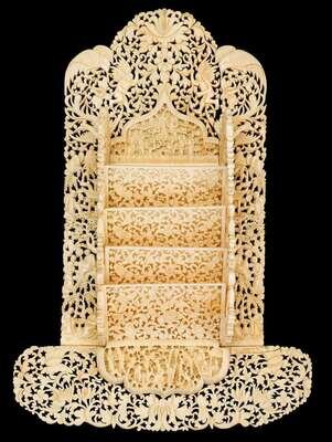 The elaborately carved openwork holder shows numerous figures among birds and lotus scrolls with four slots for letters or business cards.
