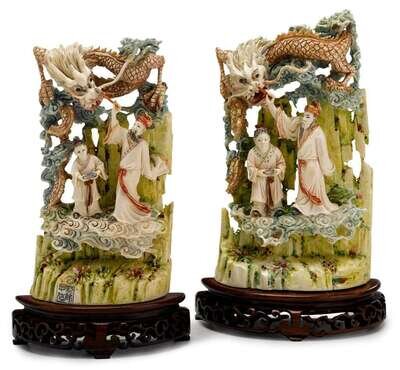 Tall rectangular models carved with surmounting dragons over celestial figural landscape, on wood stands.