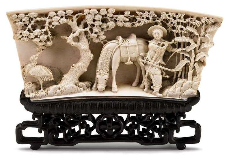 Covex out-line deeply carved to show attendant with horse in pine grove, with hard wood stand.