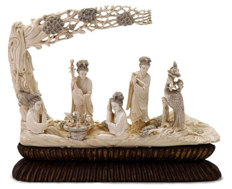 The detailed, multi-part carving depicts four meiren playing musical instruments beside a rose basket, phoenix, and pine branches over waves and under a spreading pine; with custom wood stand.