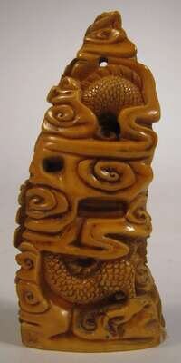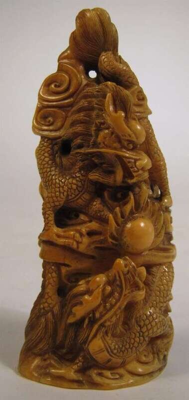Cone-shaped ivory tip carved to depict two dragons pursuing a pearl.