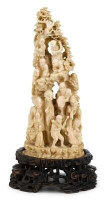 The openwork, conical carving depicts several figures among pine branches and rockwork watching a playing dog and monkey; with openwork wood base.