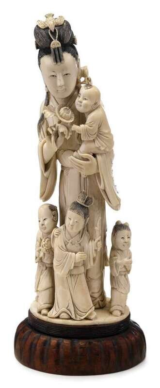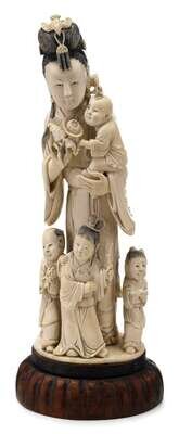 Carved to show a standing meiren in pheonix headdress and a peony flower in her right hand; she carryies a tongzi (child) in her left arm and is encircled by three boys in attendence. Ivory stained dark at hair for each character.