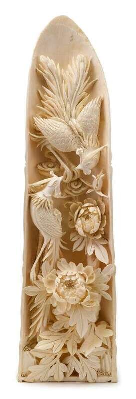 Of arched, tapering tusk form; deftly-carved interior depicts natural scenes of two phoenix among peony blossoms. Exterior carved to resemble a stalk of bamboo.
