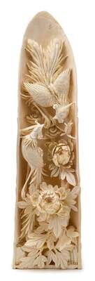 Chinese elephant ivory carving of double phoenix and peony in bamboo shoot early 20th century