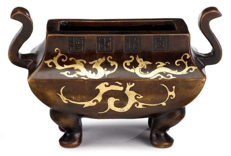 Long rectangular base issuing twin S-shaped handles, worked to show gilded coiled qilong to body and impressed four character mark, raised on pad feet.