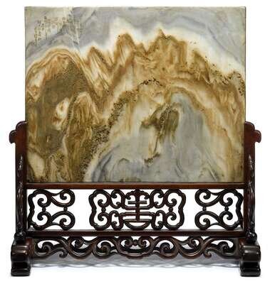 The single rectangular slab of verying hue with natural bands creating a mountain-like design; signed and inscribed with poem about mountains; with custom hardwood stand. Poetic inscription reads: 'Half of the mist is from clouds and half from fog, this stone of natural formation will be sought after by us people, mortal beings and this poem will pass on for generations because of the stone'.