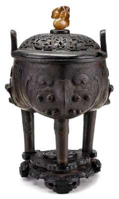 The circular censer cast in three bulbous sections and with twin handles adorned with taotie masks over a geometric ground; incised to interior with a signature in archaic script; supported by three tall and tapering tubular feet; with pierced wood cover and agate finial and well carved hardwood fitted base.