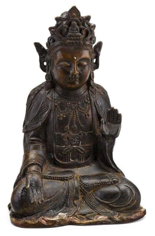The seated figure dressed in typical elaborate robes with head dress and talisman displays a benavolent mudra.