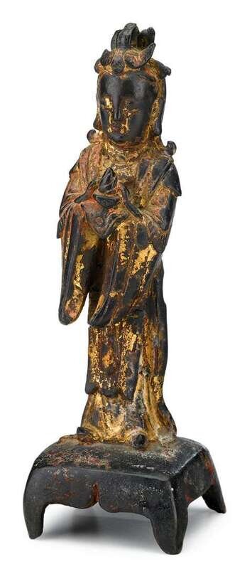 The standing figure in flowing robes wearing his/her hair in high chigon, hands holding ritual object to chest; some remains of gilding and pigment.
