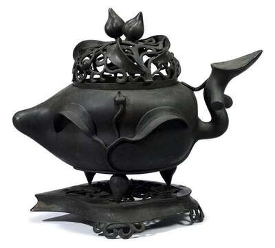 The large peach-form censer adorned with peach leaf handles and peach fruit feet; the pierced foliate dome cover bearing peach finials; above similarly pierced bronze stand.