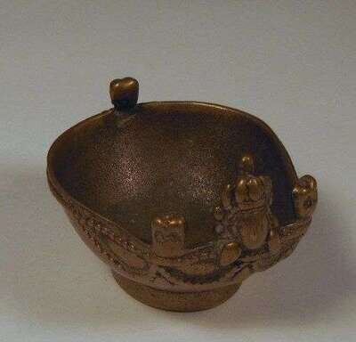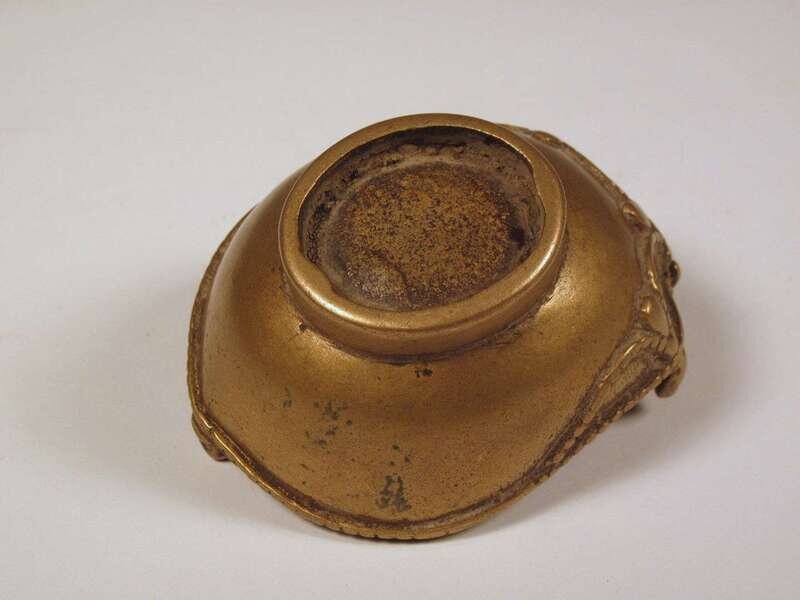The slightly oblong footed cup cast with the head of a bodhisattva and three sculls to rim.