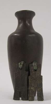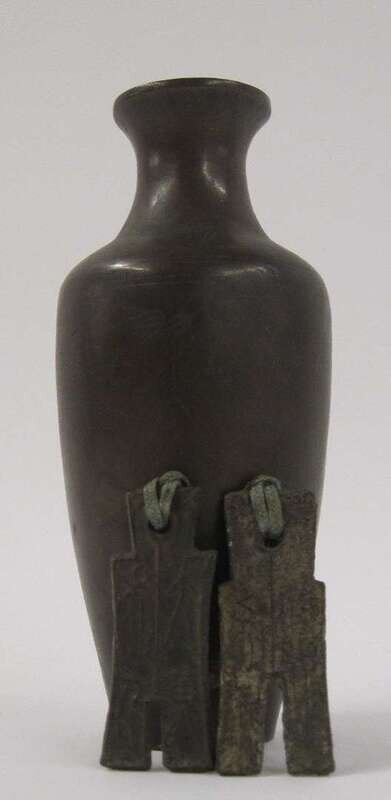 The small ovoid vase heavily cast and inlaid with silver wire to show rocks and bamboo, geometric bands, and an inscription; together with two strung archaic bronze talismans.