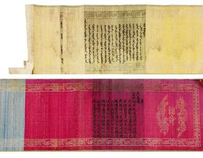 Hand scroll, manchu and regular script on brocade silk, in two parts, with seal, 'confering a title of Duke of the highest order upon Tong Guo' with fragment of original red brocade cover
