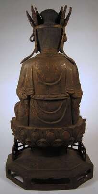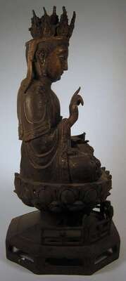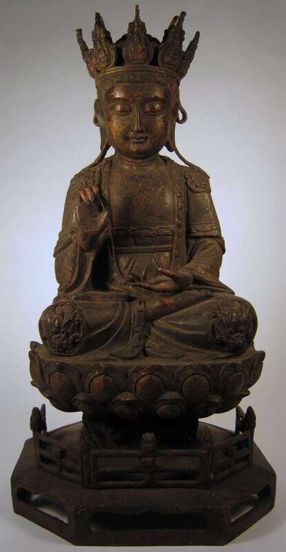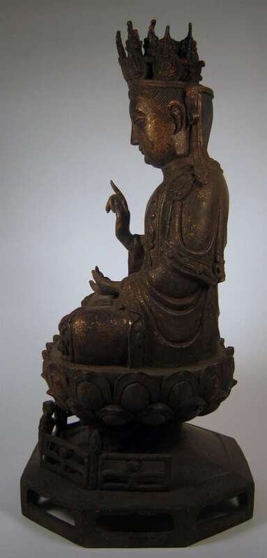 Typical seated Bodhisattva, over lotus thrown and lattice bracket base.