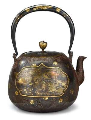 Japanese silvered and gilded iron teapot kyoto mark, meiji period