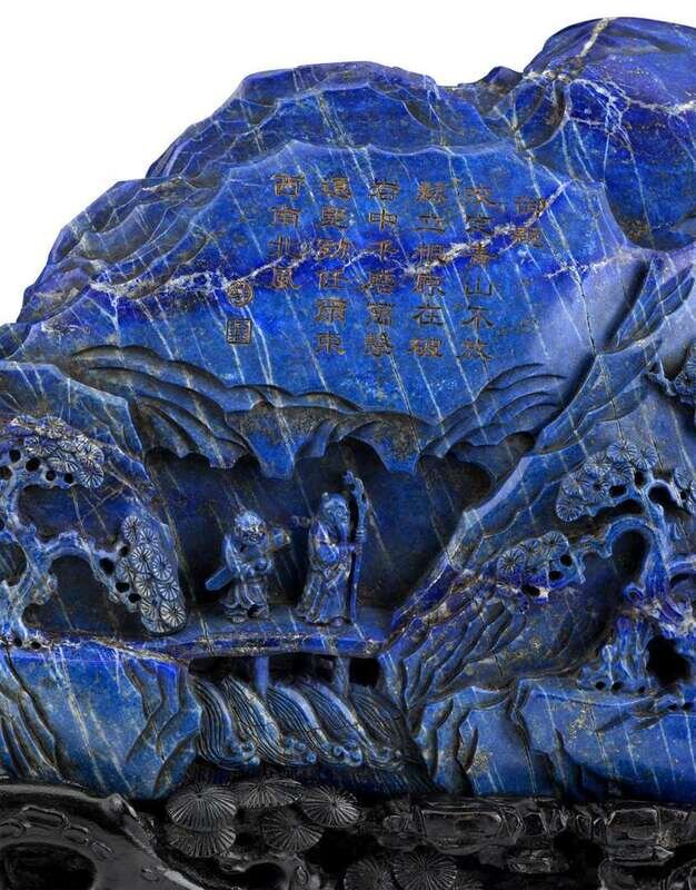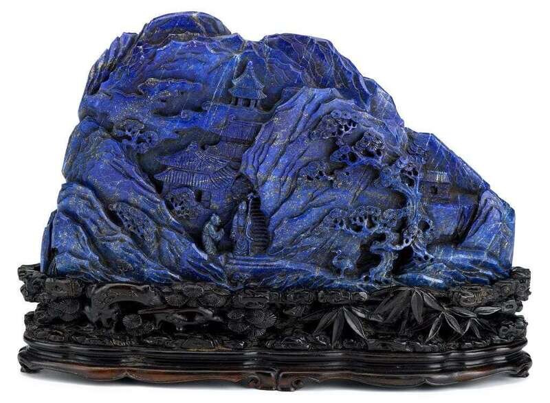 The large mountain carved to show figures, architectural structures and a single goose among spreading pines in a craggy landscape; inscribed with poem celebrating pine trees; stone of rich cobalt blue with gold flecks; with well-carved fitted hardwood stand.