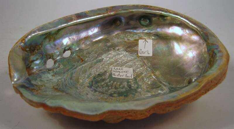 The large shell with pearlescent interior features three so-called "blister pearls" and three natural holes to the surface.